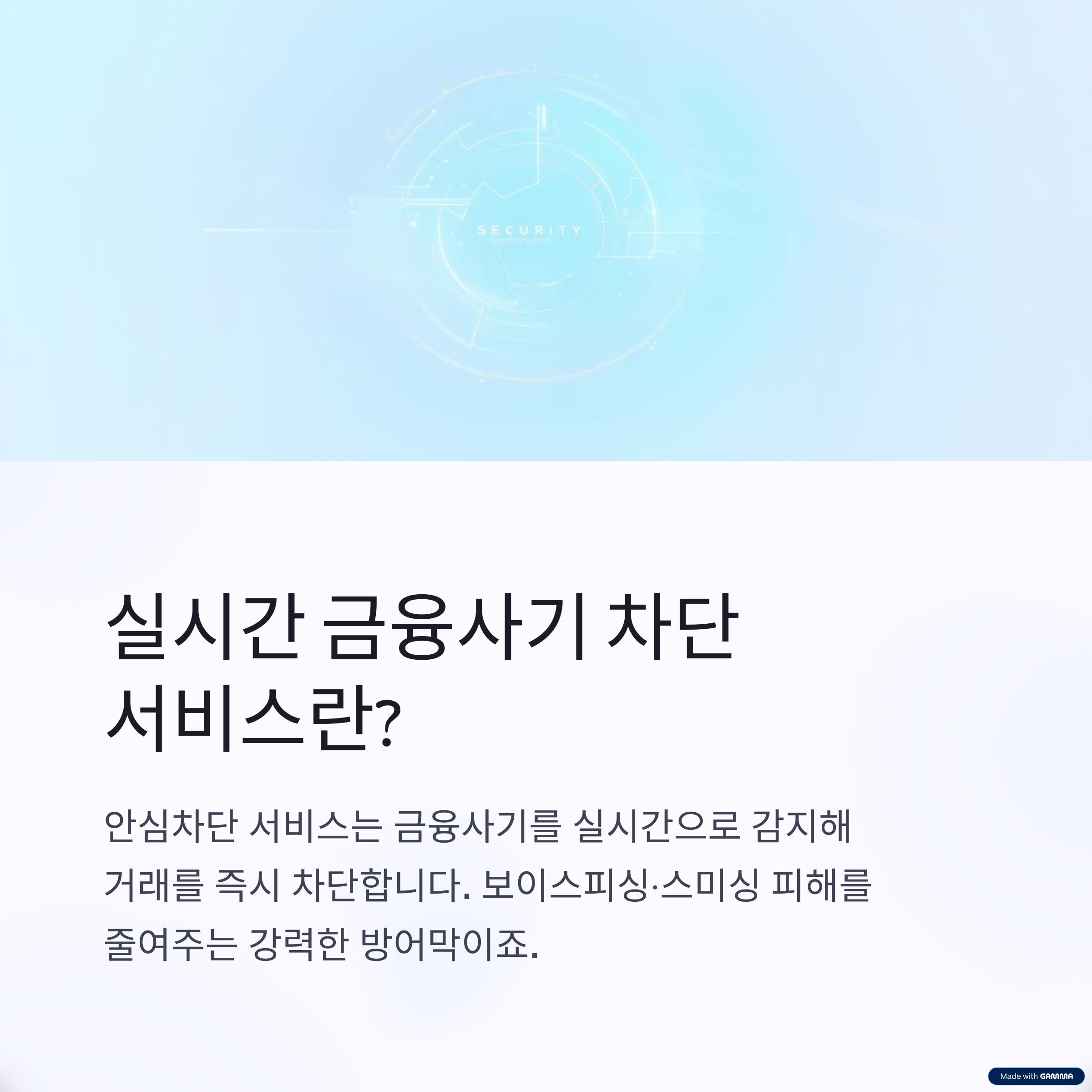 금융거래 안심차단 서비스는 의심스러운 금융 거래를 실시간으로 감지하고 차단해주는 보안 기능이에요.
