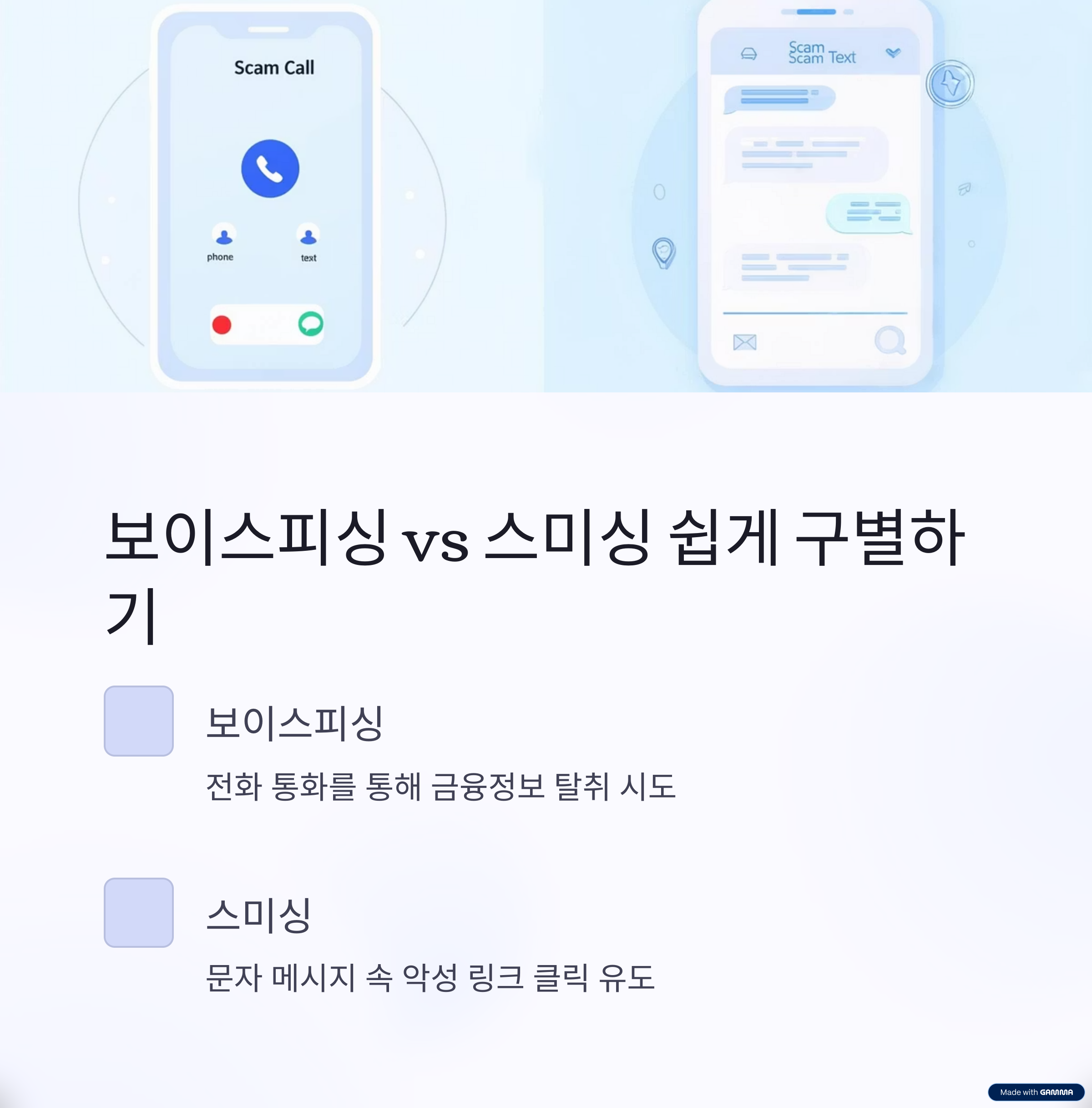 보이스피싱은 전화로 직접 말하면서 속이는 방식이에요.