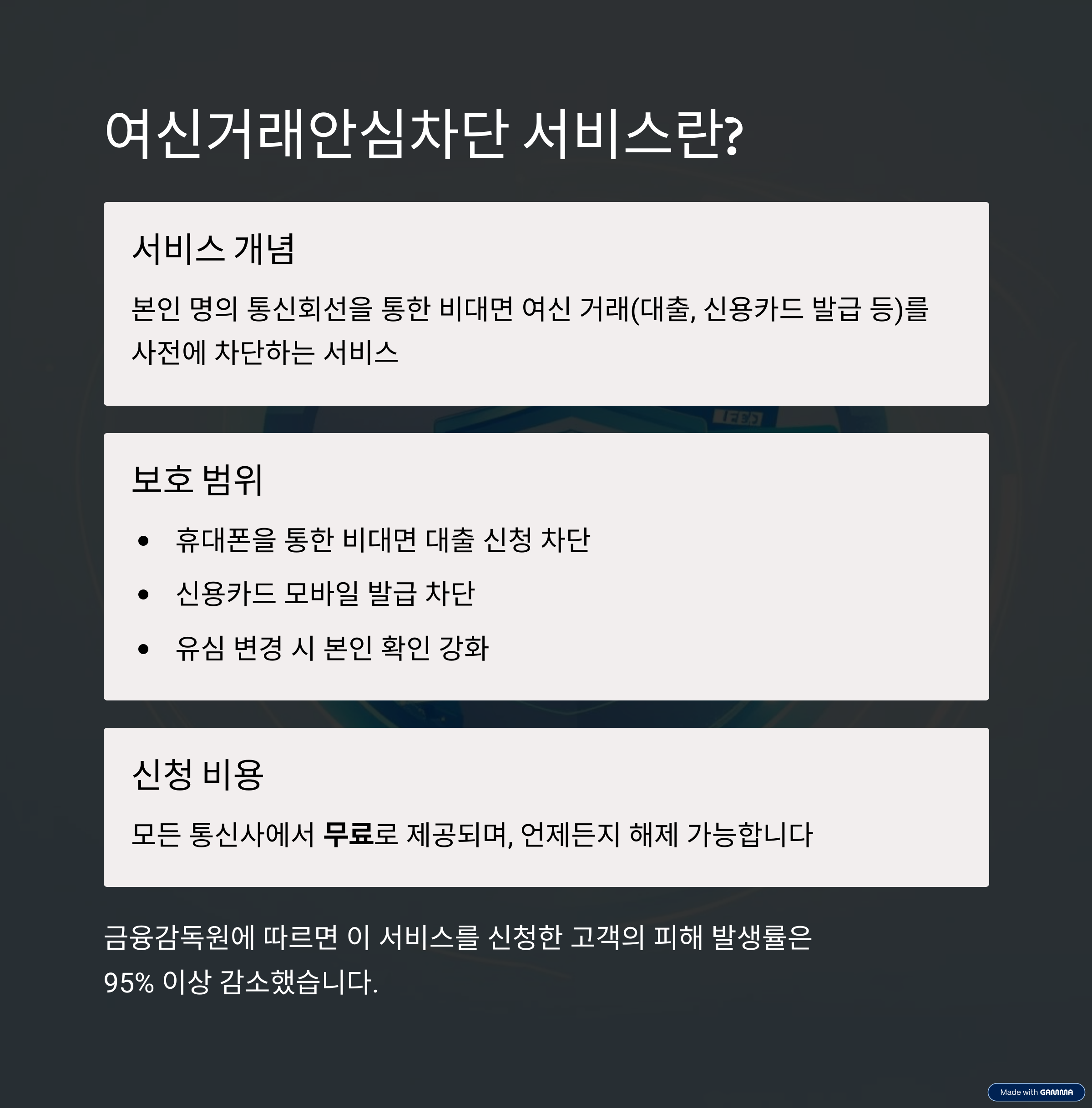 여신거래안심차단서비스는 본인의 의사 없이 개설된 대출·카드 등 여신거래를 사전에 차단하는 서비스입니다.