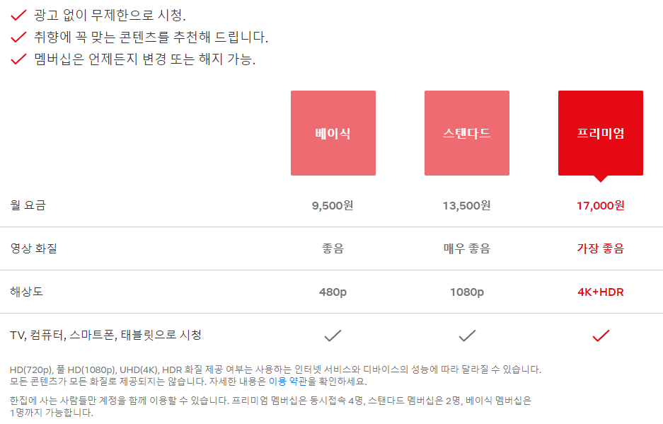 혼자 시청하는 경우 특히 TV가 4K를 지원하지 않는 경우 표준 요금제로 충분할 수 있습니다. 그러나 4K TV로 시청하거나 다른 사람과 계정을 공유하는 경우 프리미엄 플랜은 추가 비용을 지불할 가치가 있습니다.