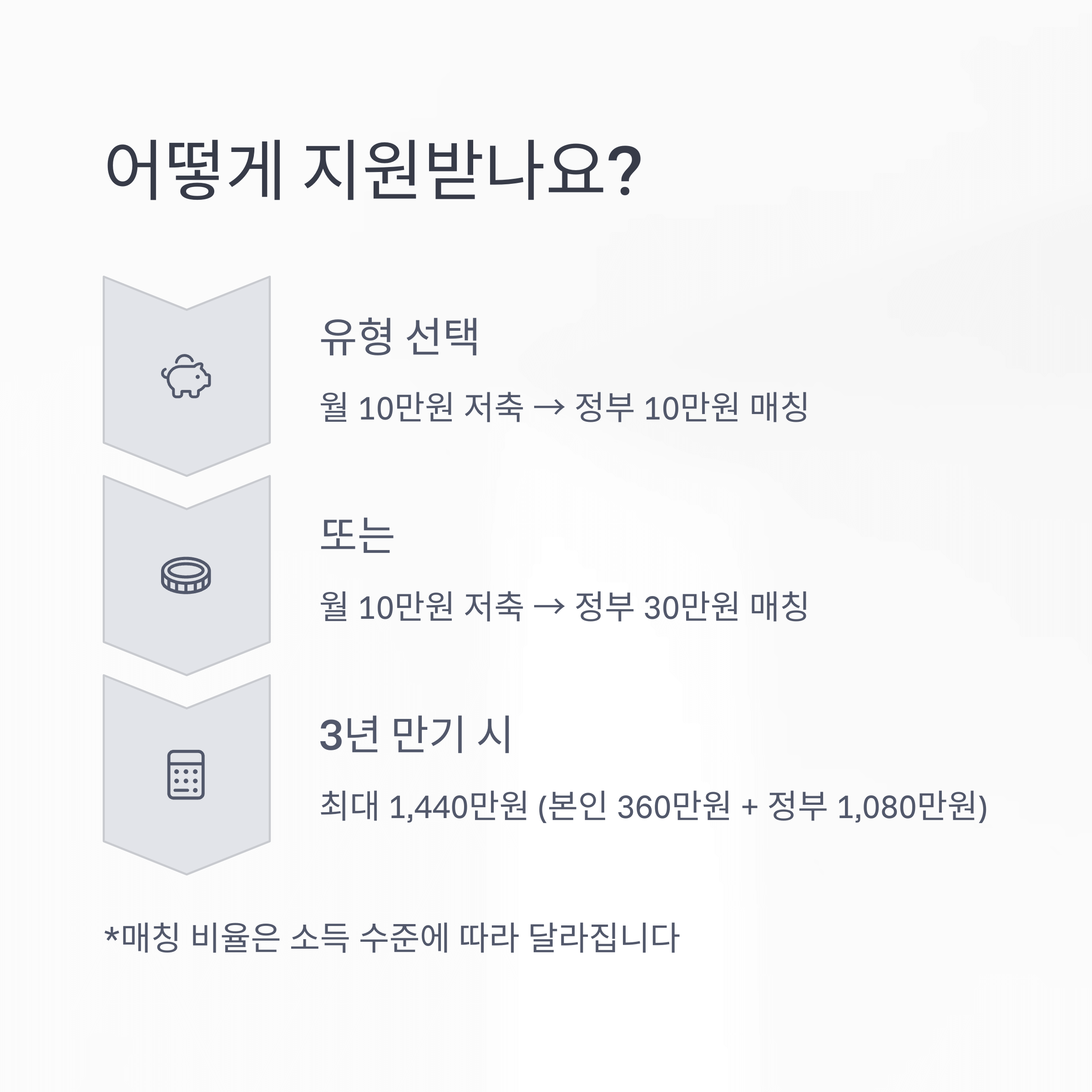 매달 10만 원씩 3년간 저축하면, 정부가 추가 지원을 얹어주는 제도다.