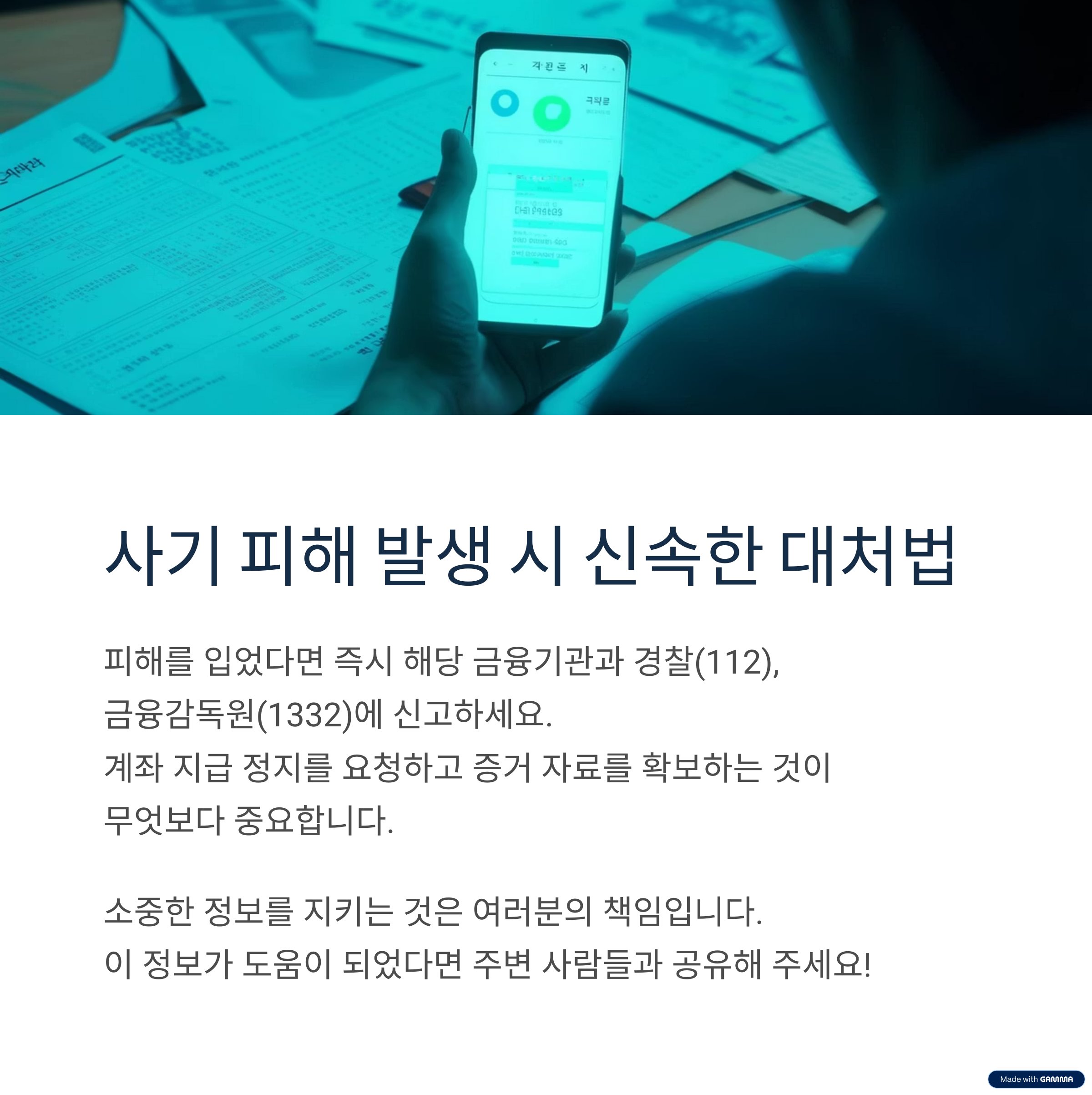 - 금융감독원 피해구제센터(1332)에 접수해 피해 복구를 요청하세요.