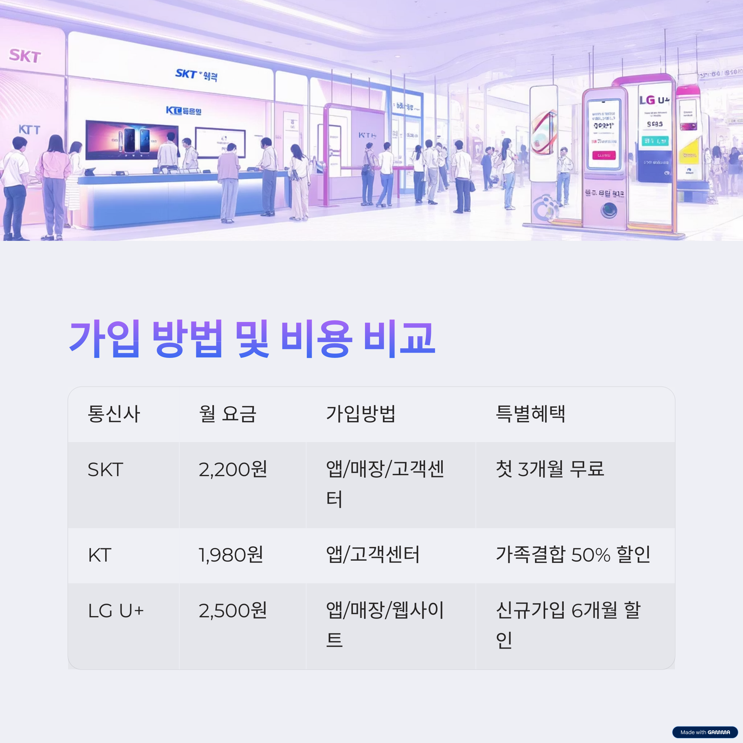 - SKT: T월드 앱 또는 고객센터에서 무료 가입 가능