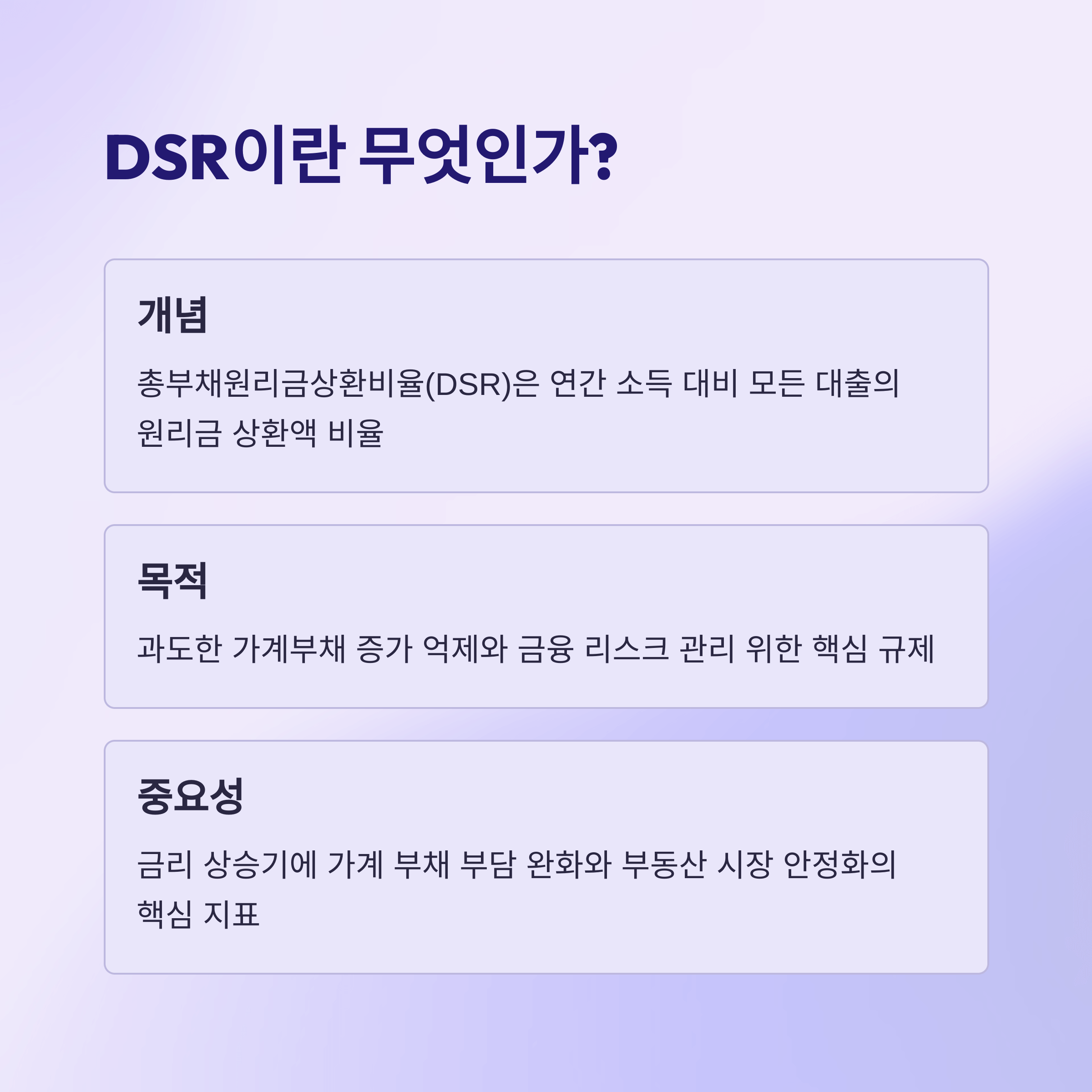 DSR 규제 강화, 7월부터 대출 ‘속도제한’이 걸린다DSR이 뭐고, 왜 다시 주목받는가?DSR은 “총부채원리금상환비율”이다.쉽게 말해 연소득 대비 갚아야 할 모든 대출의 원리금 비율을 뜻한다.이
