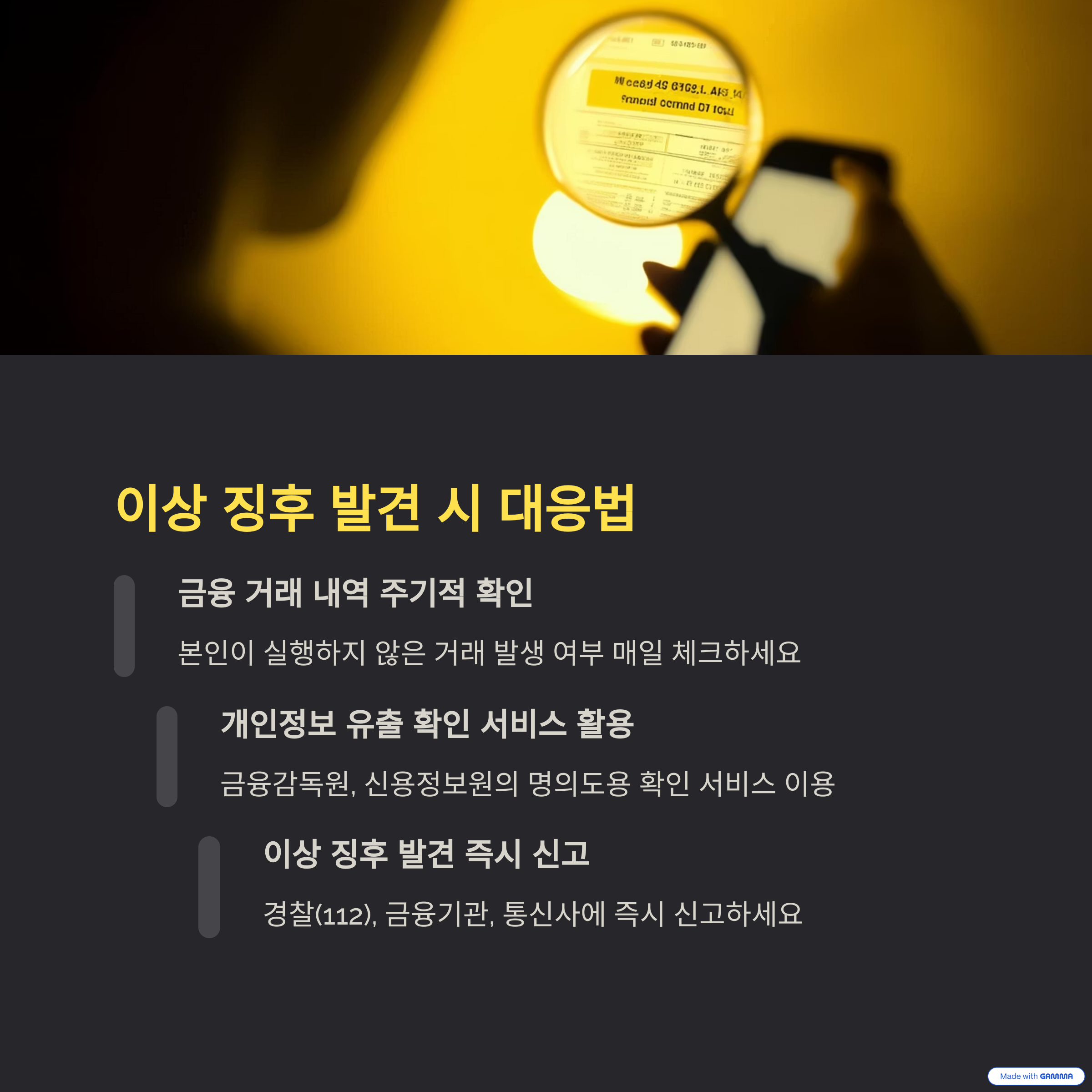 셋째, 이상 감지 시 금융감독원이나 사용 은행 고객센터에 바로 신고하세요.